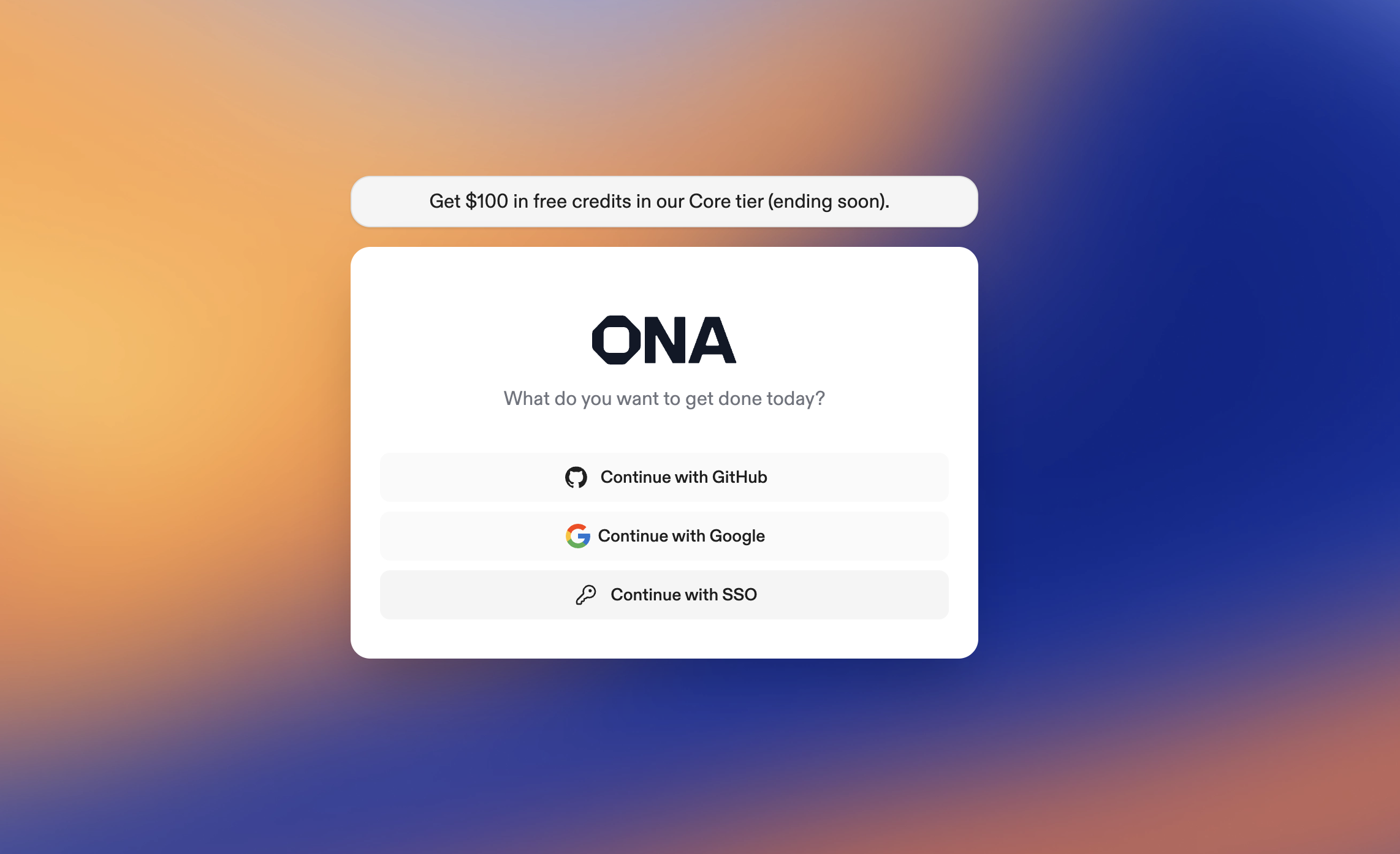 Choose "Continue with GitHub" and authenticate using the GitHub account you created in Step 2. If asked, authorize access to your Github account (you may see it referred to as Ona Hosted Compute or Gitpod Flex or gitpod-io).