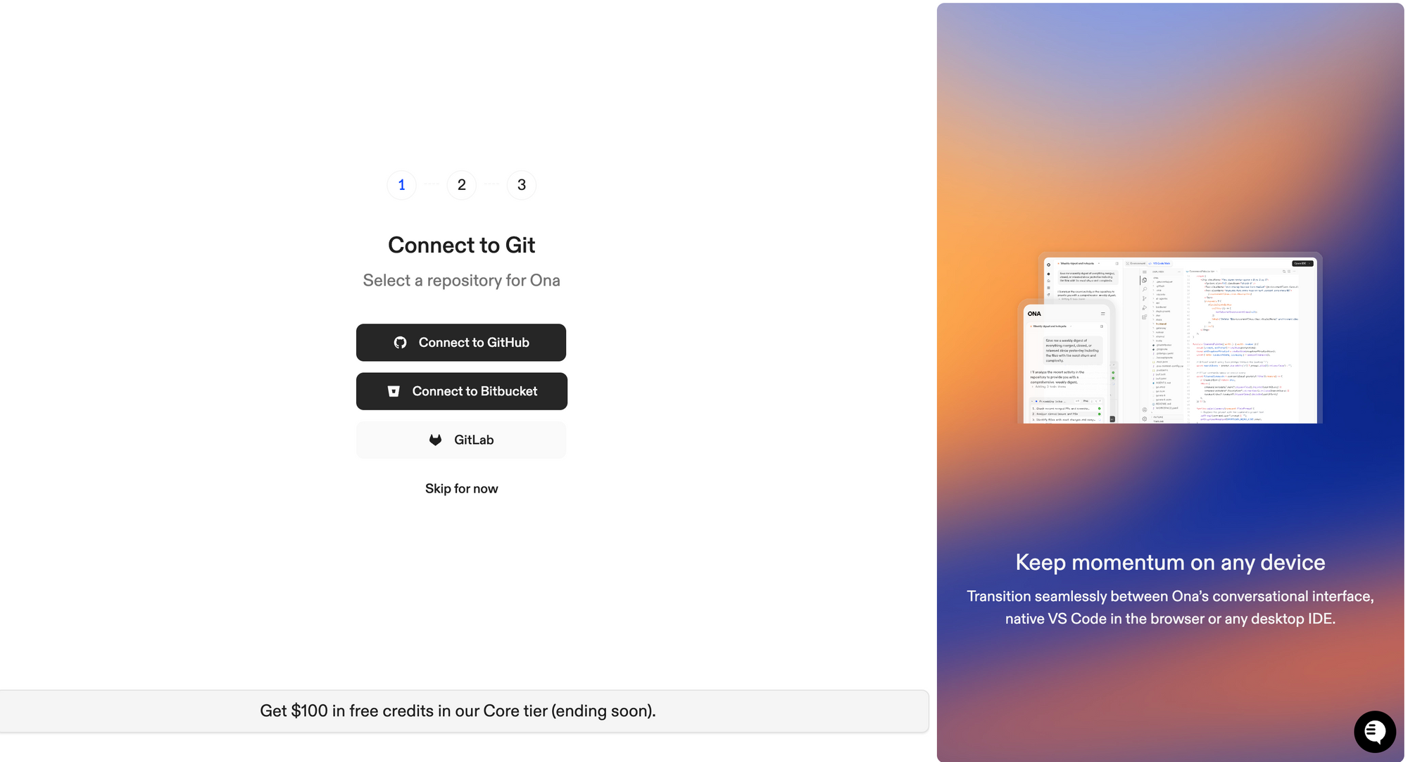 Once you've authenticated and authorized access via Github, you'll next be asked to "Connect to Git" (step 1 of 3 in Ona's onboarding). Click "Skip for now" (we'll do this in class together week 1).
